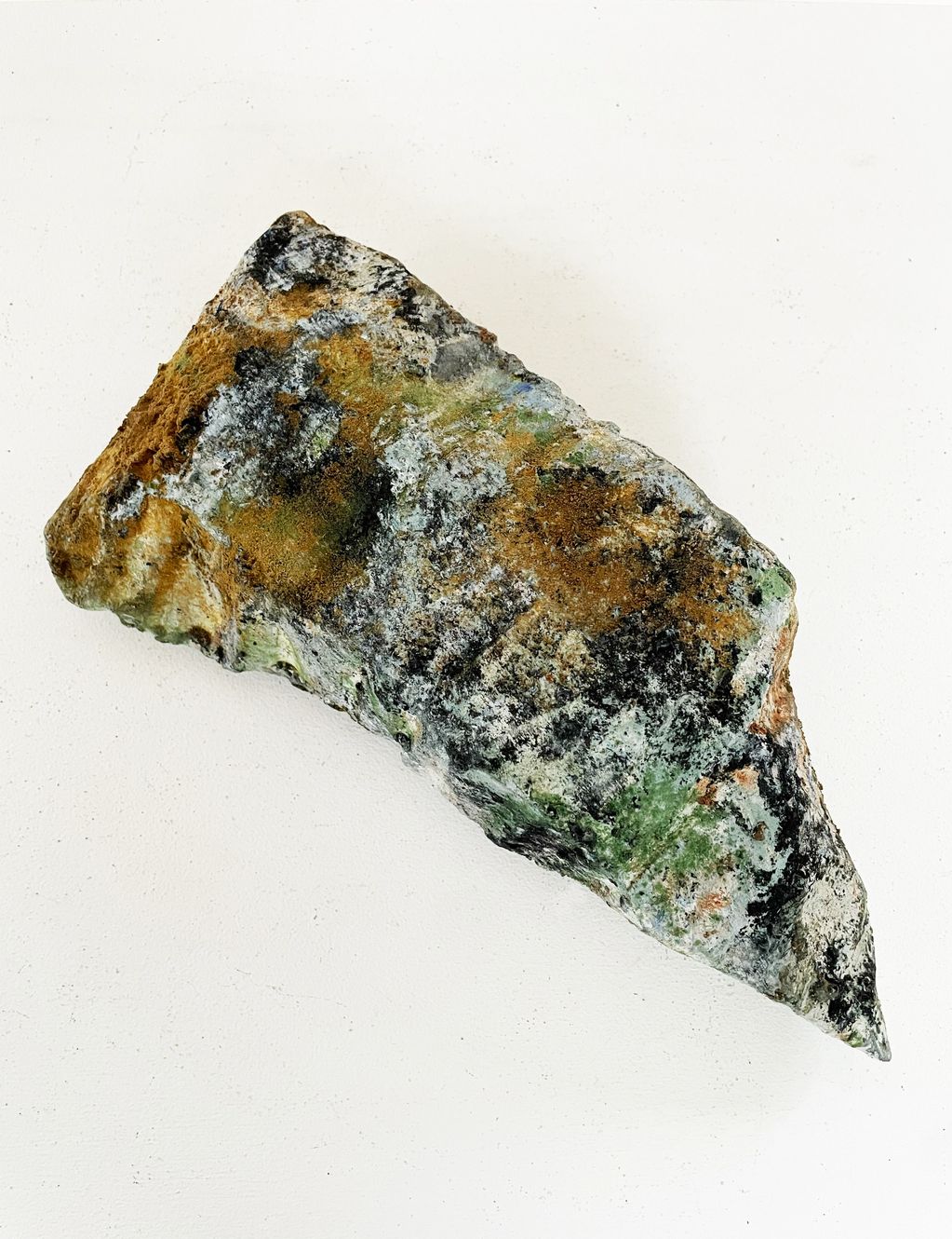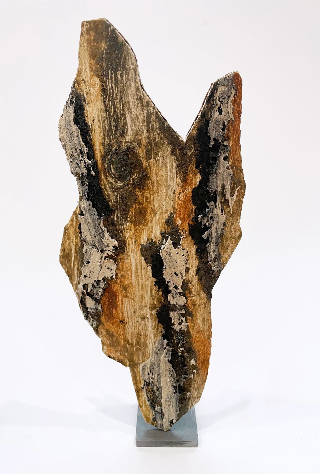 Earth pigment mixed with walnut oil, on sculpted cardboard, plant-based gesso, metal stand included