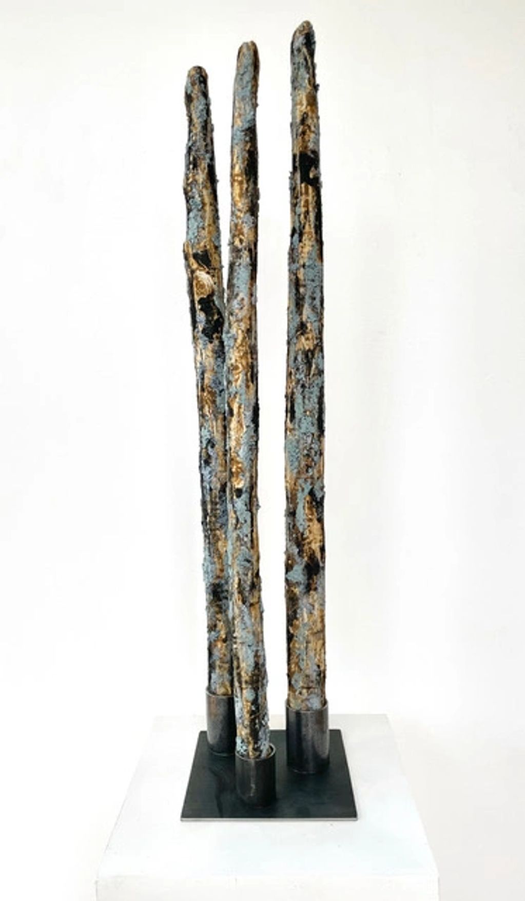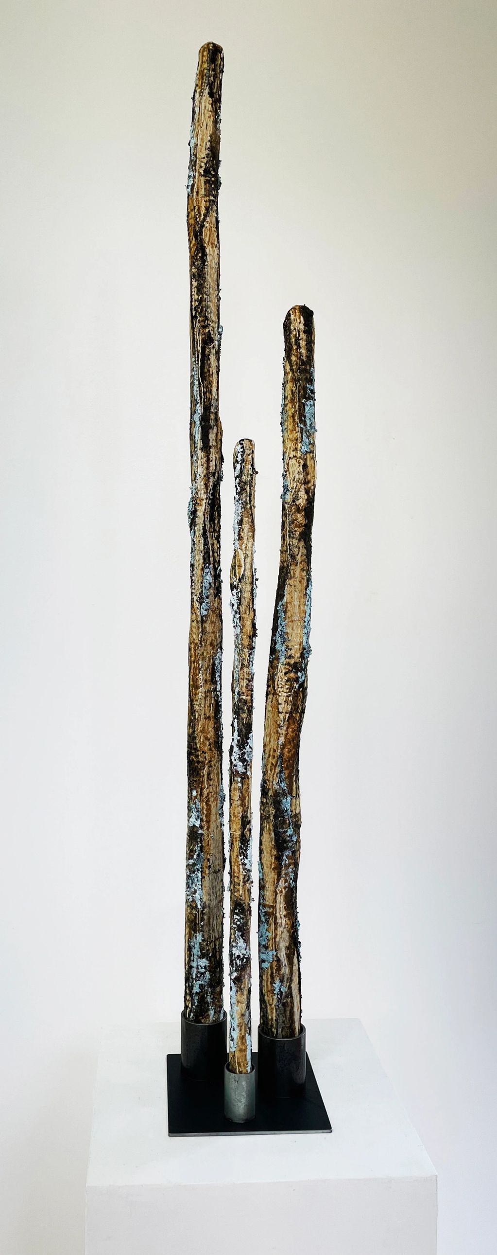 Sculpture - foraged earth pigments like local yellow ochre, blue creek clay and charred wood, ground with a pestle mortar, mixed with walnut oil, on scrap sculpted cardboard, plant-based gesso, non toxic glue. Scrap metal stand