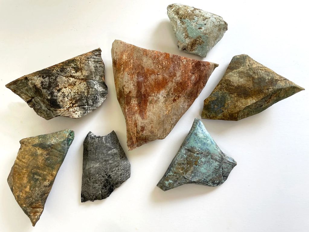 Sculptures - foraged earth pigments like local yellow ochre, blue creek clay and charred wood, ground with a pestle mortar, mixed with walnut oil, on scrap sculpted cardboard, plant-based gesso, non toxic glue.