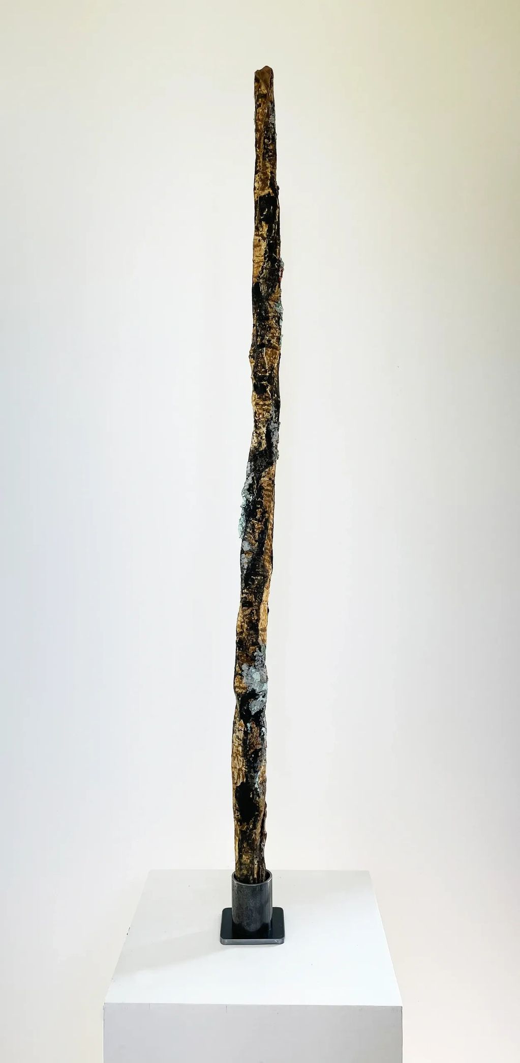Sculpture - Foraged earth pigments like local yellow ochre, blue creek clay and charred wood, ground with a pestle mortar, mixed with walnut oil, on scrap cardboard, plant-based gesso, scrap metal stand